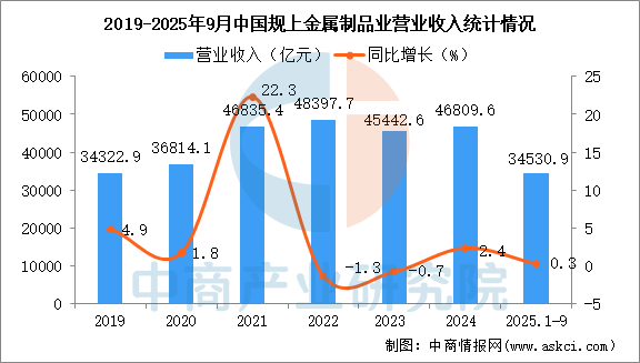 中商情報網(wǎng)訊:2025年1-9月,全國規(guī)模以上金屬制品業(yè)營業(yè)收入和營業(yè)成本均出現(xiàn)同比增長,利潤總額出現(xiàn)同比增長。
