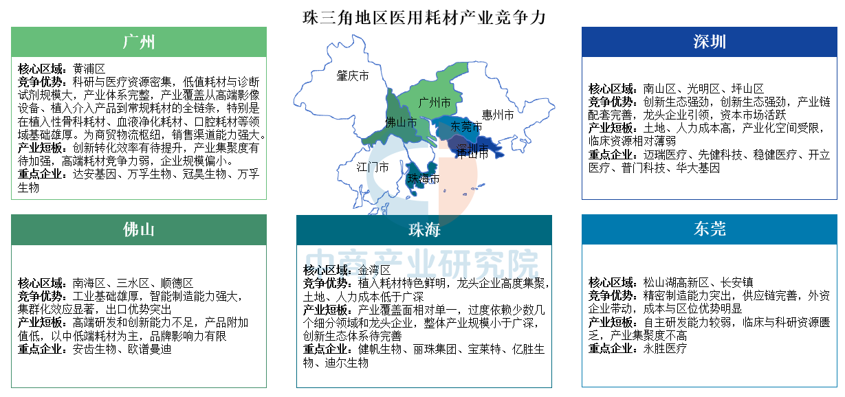 珠三角地區(qū)已形成特色鮮明、優(yōu)勢互補的醫(yī)用耗材產(chǎn)業(yè)格局,其中廣州憑借其完整的產(chǎn)業(yè)體系、密集的科研醫(yī)療資源和強大的商貿(mào)渠道,在低值耗材與診斷試劑領域規(guī)模領先,但面臨創(chuàng)新轉(zhuǎn)化和高端領域競爭力的挑戰(zhàn);深圳則以強勁的創(chuàng)新生態(tài)、完善的產(chǎn)業(yè)鏈和龍頭企業(yè)的引領作用見長,尤其在高端醫(yī)療設備領域?qū)嵙ν怀觯苤朴诟叱杀竞团R床資源短板;珠海在植入耗材領域特色顯著,龍頭企業(yè)高度集聚,成本相對較低,但產(chǎn)業(yè)覆蓋面較單一且創(chuàng)新體系有待完善;佛山依托雄厚的工業(yè)基礎和智能制造能力,在出口和中低端耗材生產(chǎn)上具有集群優(yōu)勢,但研發(fā)能力和品牌影響力不足;東莞則發(fā)揮其精密制造與完善供應鏈的特長,成本與區(qū)位優(yōu)勢明顯,但自主研發(fā)能力和產(chǎn)業(yè)集聚度是其發(fā)展瓶頸。