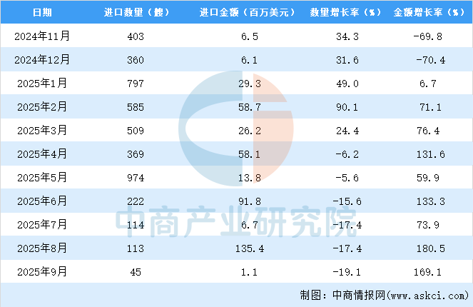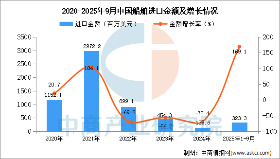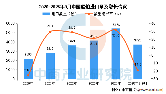 2025年9月中國(guó)船舶進(jìn)口量及金額增長(zhǎng)情況